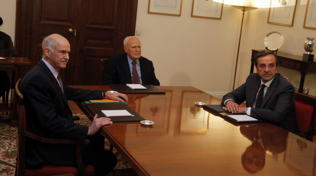 Και έγινε το εξής τραγικό: Ο πρωθυπουργός της χώρας καλοσώρισε τη νέα κυβέρνηση, μίλησε για πρόσωπο με θεσμική ιδιότητα, και επι της ουσίας αποχαιρέτησε τον ελληνικό λαό και παραιτήθηκε!ώρα αργότερα αναχωρούσε για το Προεδρικό Μέγαρο για να υποβάλλει και επισήμως την παραίτησή του στον Κάρολο Παπούλια. Στο διάλογο που ακολούθησε εκτός από τα τυπικά και τις μεγαλοστομίες, μια κουβέντα του κ. Παπούλια τα είπε όλα: "Κύριε Πρόεδρε υπάρχει μια Πλέον το νερό είχε μπει στ' αυλάκι. Στις 7 Παπανδρέου, Σαμαράς και Καρατζαφέρης πέρασαν το κατώφλι του Προεδρικού Μεγάρου και όλοι αναστέναξαν με ανακούφιση. Απόψε θα είχαμε κυβέρνηση.