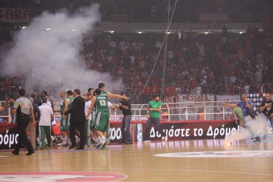 Μια φωτοβολίδα σκάει, ο πάγκος του Παναθηναϊκού σηκώνεται και όλοι αρχίζουν να τρέχουν. Κάπως έτσι, τελείωσε ο τρίτος τελικός της Α1 μπάσκετ ανάμεσα σε Ολυμπιακό και Παναθηναϊκό....