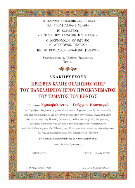 Ἀπὸ τὰ διαμάντια τῆς νεολαίας μας ποὺ ἀνακαλύπτομε μέσῳ συστηματικῶν ἐρευνῶν διὰ νὰ ἔχῃ μέλλον τὸ Τάμα τοῦ Ἔθνους καὶ οἱ λοιποὶ ἐθνωφελεῖς σκοποὶ τοῦ Ἱδρύματός μας, εἶναι καὶ ἕνας ἀπὸ τοὺς ὑποτρόφους τοῦ Ἱδρύματός μας (ποὺ λαμβάνουν μηνιαίως τὸ σεβαστὸν ποσὸν τῶν ἑπτακοσίων Εὐρώ – δώδεκα (12) μῆνες τὸ ἔτος), ἀριστοῦχος φοιτητὴς τῆς Ἀρχιτεκτονικῆς, Χρυσοβαλάντης – Γεώργιος Κουγιαγκάς, ὁ ὁποῖος διεκήρυττε ἀπὸ μικρὸ παιδί: «ἐκ νηπιακῆς ἡλικίας ἐπιθυμῶ νὰ γίνω ἀρχιτέκτων».