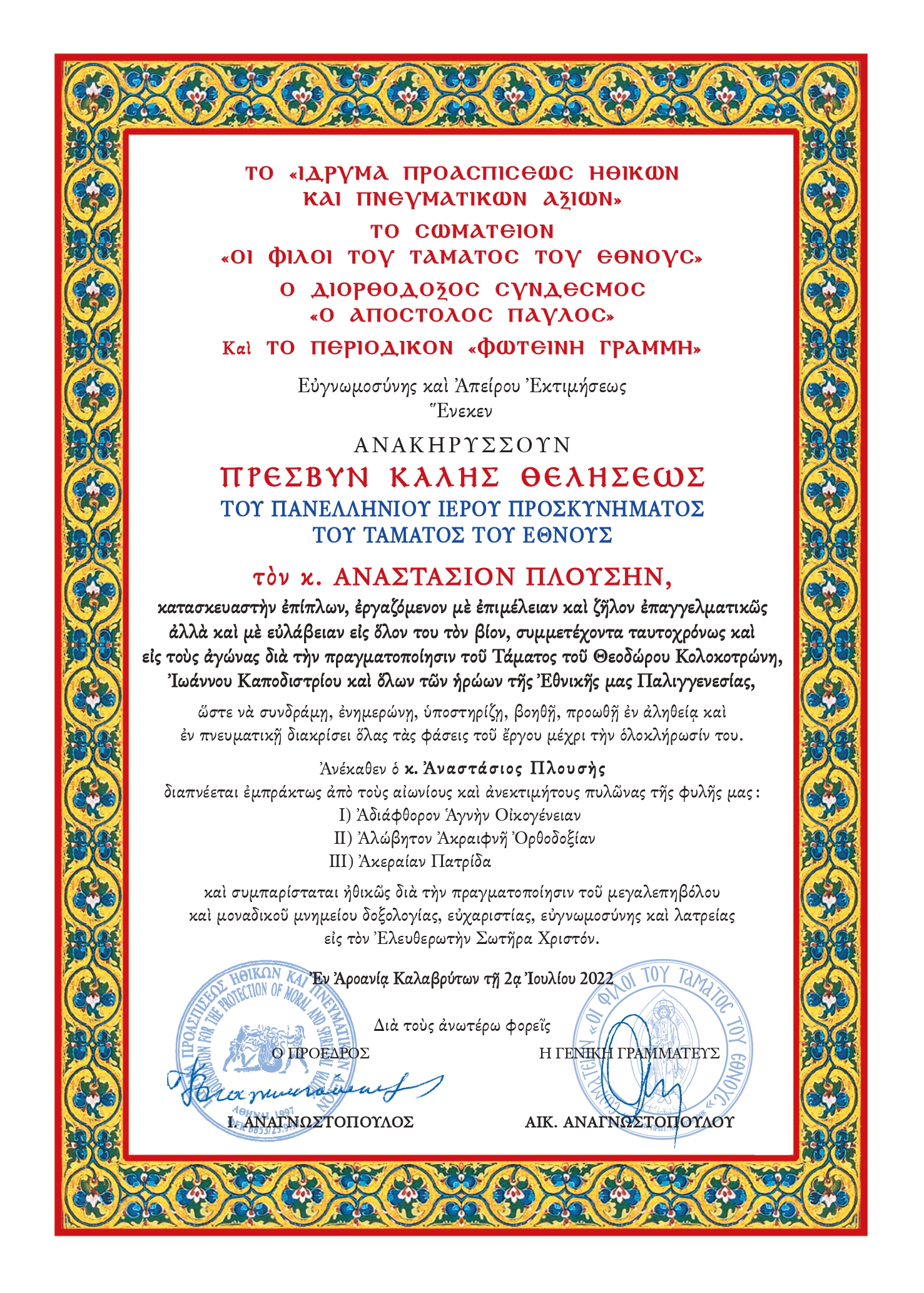 Κατὰ τὴν πανήγυριν ἐβραυβεύσαμε καὶ τὸν κ. Ἀναστάσιον Πλουσήν, Καλλιτέχνην Ἐπιπλοποιόν. Κάθε ἄνθρωπος, ἀπὸ ὅποιο ὀχυρὸ καὶ ἄν ἀγωνίζεται, ὅταν ἐργάζεται μὲ ζῆλον καὶ μὲ εὐλάβειαν, εἶναι ἄξιος ἐπαίνων. Ὁ κ. Ἀναστάσιος Πλουσής ἐπὶ πλέον ἀγωνίζεται καὶ διὰ τὴν πραγματοποίησιν τοῦ Τάματος τοῦ Θεοδώρου Κολοκοτρώνη, Ἰωάννου Καποδιστρίου καὶ ὅλων τῶν ἡρώων τῆς Ἐθνικῆς μας Παλιγγενεσίας.