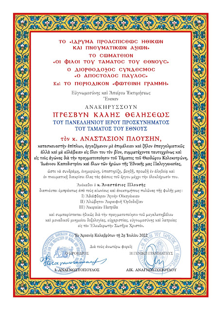 Τὴν βράβευσιν παρέδωσε εἰς τὸν κ. Πλουσὴν ὁ Καθηγητὴς κ. Γεώργιος Πάχτας, ο ὁποῖος ἐταξείδευε ὅλην τὴν νύκτα ἀπὸ τὴν Θεσσαλονίκη εἰδικὰ γιὰ νὰ εἶναι τὸ Σάββατο 2.7.2022 εἰς τὸν πανηγυριζοντα Ἅγιο Παῦλο.